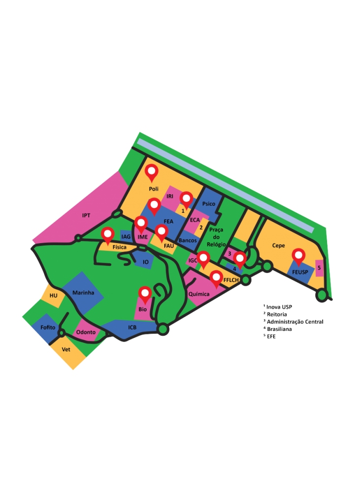 Mapa da Cidade Universitária da USP em São Paulo com locais para home office